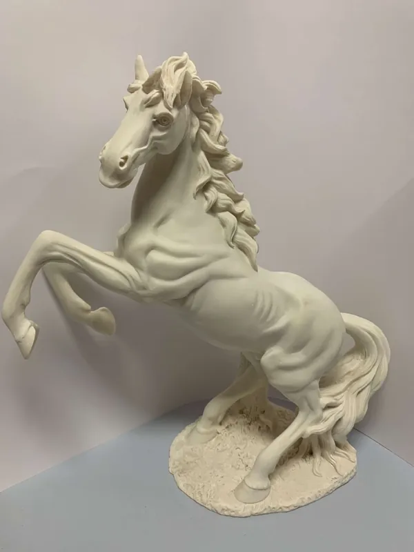 Figura de marmolina de un caballo encabritado.Material: polvo de alabastro, macizo.Peso: 3,8 kgs.Medidas: 39×30 cms.