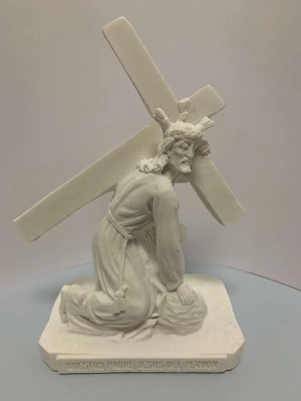 Figura de marmolina (alabastro). Más resistente que la escayola y de mejor acabado. Además no es porosa, por lo que no necesita el uso de tapaporos.Figura de marmolina de Nuestro Padre Jesus del Perdón.Material: polvo de alabastro (marmolina), macizo.Peso: 330 gramos.Medidas: 15 cms. de altura.