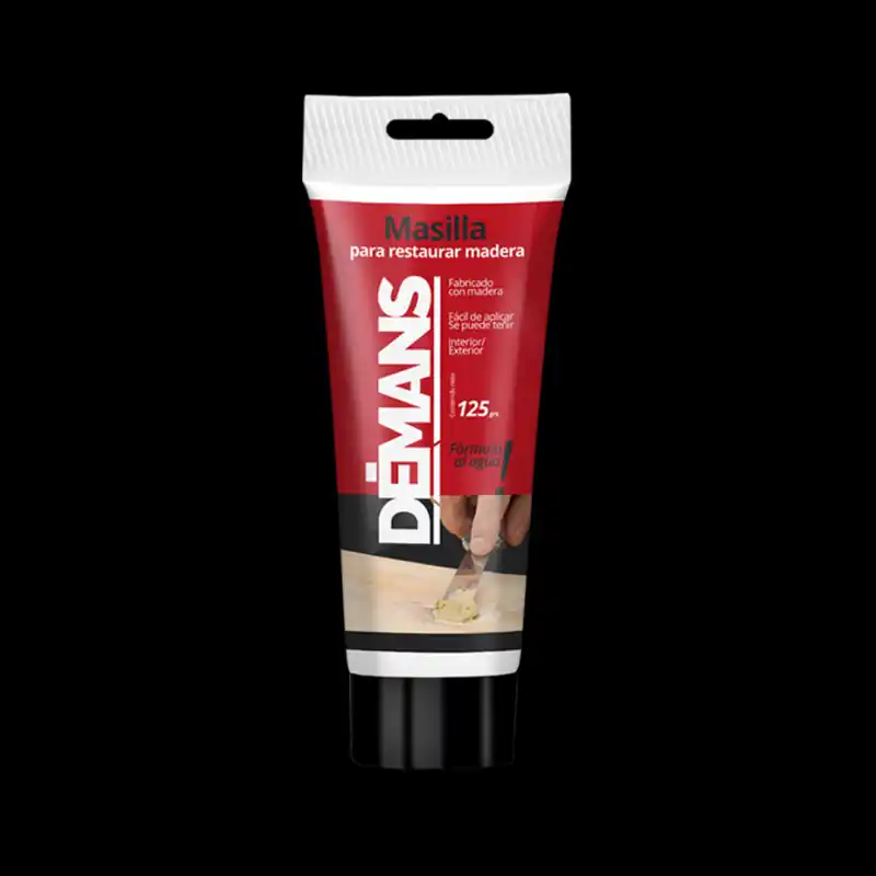 Masilla repara madera Demans PINOMasilla fabricada a base de resinas y pasta de madera para la reparación y conservación de todo tipo de maderas. Una vez aplicado y adherido el producto a la superficie de madera, puede ser lijado, barnizado, pintado, perforado o trabajado como la propia madera.DescripciónRepara pequeñas irregularidades y defectos de la superficie de madera.Ayuda a repeler la humedad.Evita el secado de la madera.Realza la textura natural.Tiene la función de proporcionar una excelente adherencia.Ayuda a mejorar la estructura de la madera.Se aplica fácilmente con el uso de una espátula, sin diluir, y se puede lijar después de 3 horas.Densidad relativa: 1,8 gr/mlTiempo de secado: 4-5 h (20°C)Repintado: 3 horasAplicación: EspátulaRendimiento: 2-3m²/kgrAlmacenamiento: Proteja el producto de la congelación. No aplicar a temperaturas inferiores a 10°C y superiores a 35°C