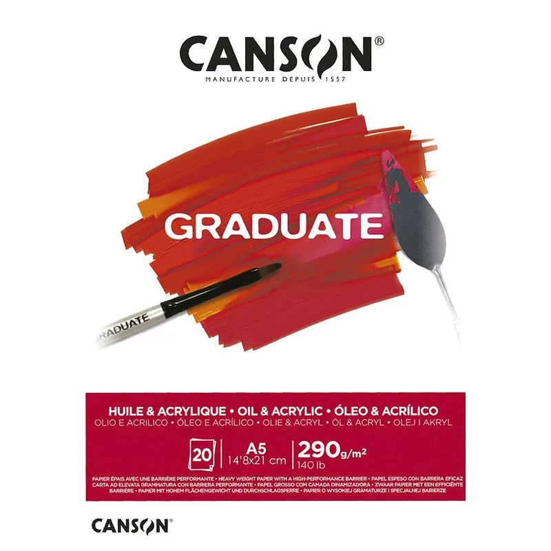 Papel blanco grueso, de gran barrera, resistente y absorbente.Blanco natural, grano medio, textura diferente al lienzo.Bloc encolado por el lado corto.Libre de ácido y sin blanqueadores ópticos.Tamaño: A5-14,8x21cm. (20 hojas) 290 gramos.