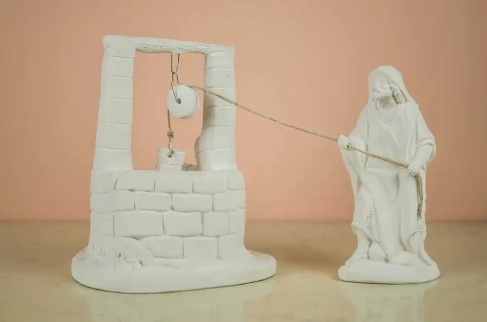 Figura de escayola para decorar.Se recomienda usar previamente tapaporos, para preparar mejor la supeficie para la pintura, logrando además que absorba menor cantidad de la misma, y pudiendo también finalmente usarlo como barniz protector de la pieza terminada.Precio total por el pocero y el pozo.