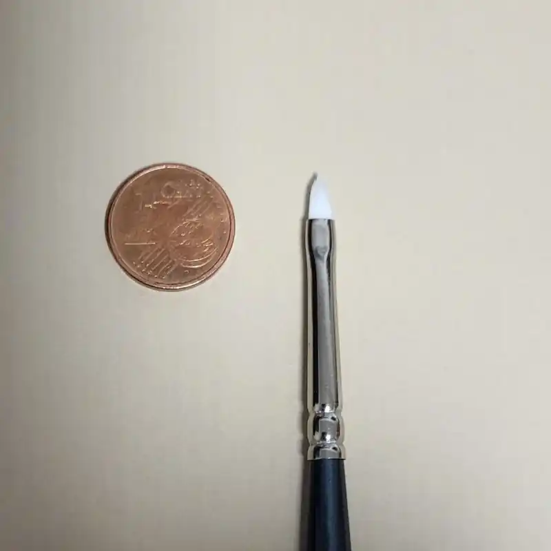 El pincel con forma lengua de gato. Un pincel versátilEl pincel con forma lengua de gato es un pincel plano pero con las esquinas redondeadas. Es un pincel versátil y que se puede utilizar de diferentes maneras. Se le conoce como pincel filbert en inglés.En los números más pequeños de esta marca, el pelo acaba bastante en punta. Un ejemplo de que éste es un pincel versátil lo podemos observar si somos aficionados a la pintura por números. En la pintura por números hay que rellenar recintos muy pequeños y otros más grandes. Con un pincel como el que se muestra en la foto, se puede utilizar la punta para los recintos pequeños y todo el ancho del pincel para los recintos más grandes.Se muestra una fotografía en la que se ve el tamaño de la cabeza del pincel en comparación con una moneda de un céntimo de euro.Los números pequeños 0, 1 y 2 son apreciados como pinceles para modelismo ya que habitualmente se pintan miniaturas. El ancho del pincel es de unos 3 milímetros y la longitud de la fibra de unos 5 milímetros.Y por último, hay que destacar el magnífico precio de este pincel. Está fabricado en Asia pero con una fibra de calidad aceptable y bien acabado. Es por lo tanto un pincel de buena calidad a un precio muy razonable. No alcanza la excelencia de otras marcas pero es más que válido para la mayoría de aplicaciones.