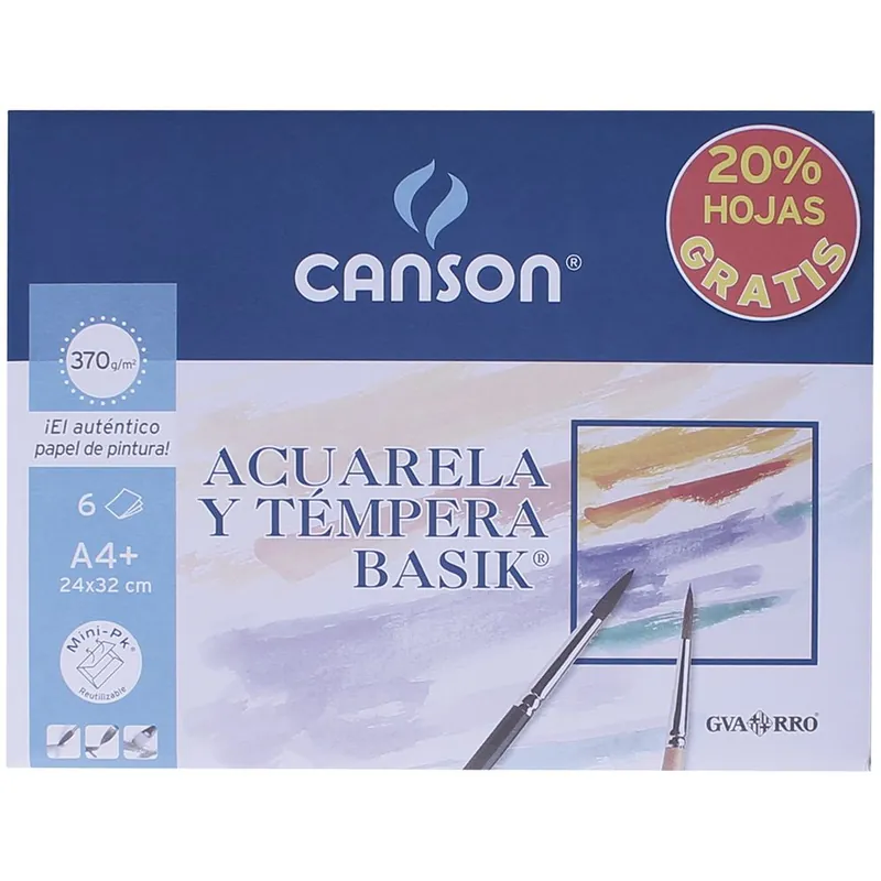 Mini-pack. Papel de color blanco natural idóneo para acuarela escolar, témpera y gouache.24X32 CM (6 hojas) 370g