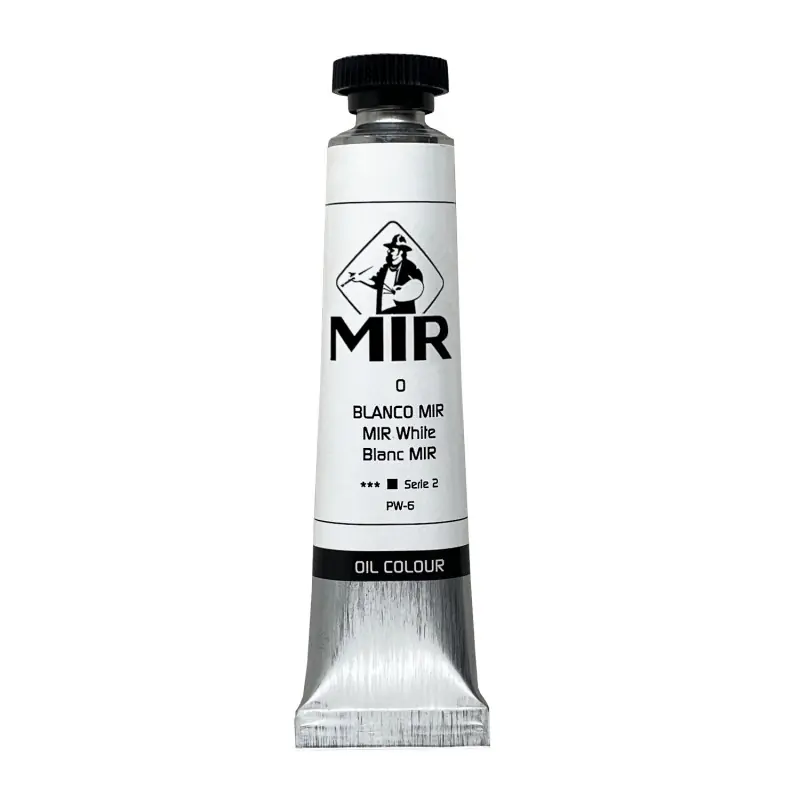 Óleo de calidad extra-fina, constituido por pigmentos específicos para bellas artes, de alta estabilidad a la luz y luminosidad. Los aceites vegetales secantes que componen el óleo Mir son escogidos para que no modifiquen el tono del pigmento, sequen uniformemente en una capa incolora, de máxima transparencia y homogeneidad.Parte fundamental de la fabricación del óleo Mir es el refinado de la pasta inicial de pigmento y aceite. Esta masa se hace pasar a través de unos molinos compuestos por tres rodillos de acero, tantas veces como sea necesario, para conseguir la perfecta dispersión de las partículas de pigmento en el medio del aceite. De esta forma el óleo obtendrá sus características de finura, cremosidad, brillo y poder tintóreo y se favorece la estabilidad en el tiempo de la pintura tanto dentro del tubo como una vez aplicada.Cada pigmento tiene un tiempo de secado natural, diferente según las condiciones de temperatura y humedad. En la fabricación del óleo Mir intentamos acercar los diferentes tiempos de secado a fin de que los colores de una obra sequen de forma pareja pero no queremos con ello comprometer la estabilidad de la pintura por lo que siempre habrán diferencias que el artista asume como consustanciales a la técnica del óleo.La gama de óleo Mir contiene básicamente colores cubrientes complementada con semi y totalmente transparentes. La cubrición es una propiedad intrínseca del pigmento en el medio aceite y el artista sabe hacer uso tanto de los pigmentos que tapan como de aquellos transparentes que le permiten sutiles efectos de veladuras.