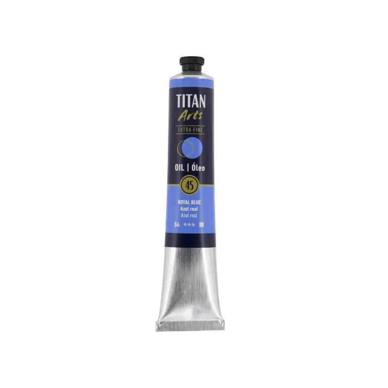 TITAN Óleo Extrafino 60cc especial para aplicar sobre lienzos de lino, algodón u otros, debidamente preparados. (Colores orientativos según carta del fabricante)Los colores al óleo TITAN Arts Extra Fine esta pensados para los artistas más exigentes, que buscan una calidad extrafina. La pintura al óleo se elabora de forma tradicional con los mejores pigmentos finamente molidos, aportando un óptimo poder de colorante gracias a la alta concentración de pigmento. La gama ofrece colores muy puros e intensos y un grado máximo de resistencia a la luz con una gran durabilidad de la capa de pintura. Azul real N°45. Tubo 60 ml.También puede aplicarse sobre otros soportes, como madera, táblex, cartón, etc., siempre que estén impermeabilizados con una adecuada preparación, para que tengan una buena adherencia.Secado a 23ºC 60 % HR: 1 día – 15 días (según pigmentación).Los tiempos de secado, se corresponden a una aplicación de un grosor aproximado entre 0,1 y 0,5mm.Métodos de Aplicación: Pincel, paletina o espátula.Limpieza de utensilios: Limpia Pinceles, disolvente.Presentación: Tubos: 20 ml, 60 ml y 200ml
