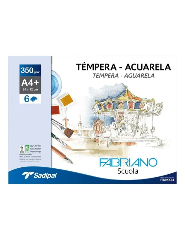 Sobre de papel con 6 hojas de 350 gramos ideal para tempera, acrilico y acuarela. Con un grano fino