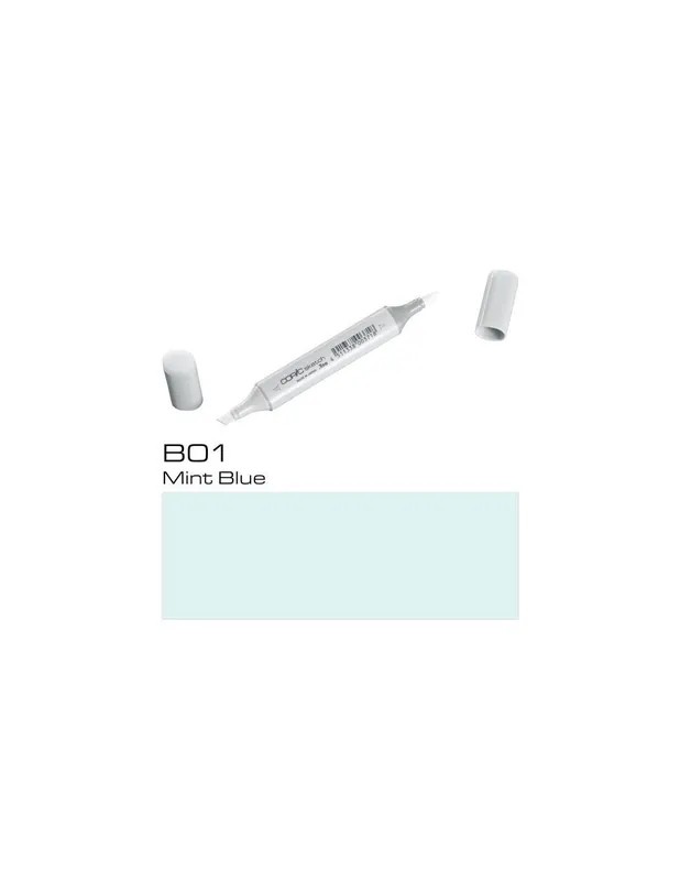 ROTULADOR COPIC SKETCH B01 Mint BlueCOPIC SKETCH B01 Mint BlueLos rotuladores copic sketch son los rotuladores preferidos de los profesionales del diseño, la ilustración, el dibujo manga y el scrap.Con sus 358 colores tienes todo un mundo de posibilidades a tu alcance, es la mayor gama de colores que existe en rotuladores, dificilmente no encontrarás aquella tonalidad que estás buscando.El rotulador copic sketch tiene dos puntas: una biselada para colorear grandes áreas y otra de pincel muy flexible ideal para dibujar. Las puntas se pueden cambiar cuando se gastan.Son rotuladores recargables, se puede volver a aprovechar la carcasa, con un frasco de tinta copic ink de 25 cc puedes rellenar hasta 12 veces un sketch.La tinta copic es a base de alcohol, es permanente y no es tóxica. Cuando se seca está libre de ácido.Los rotuladores copic sketch se pueden utilizar también con el sistema de aerografia copic.