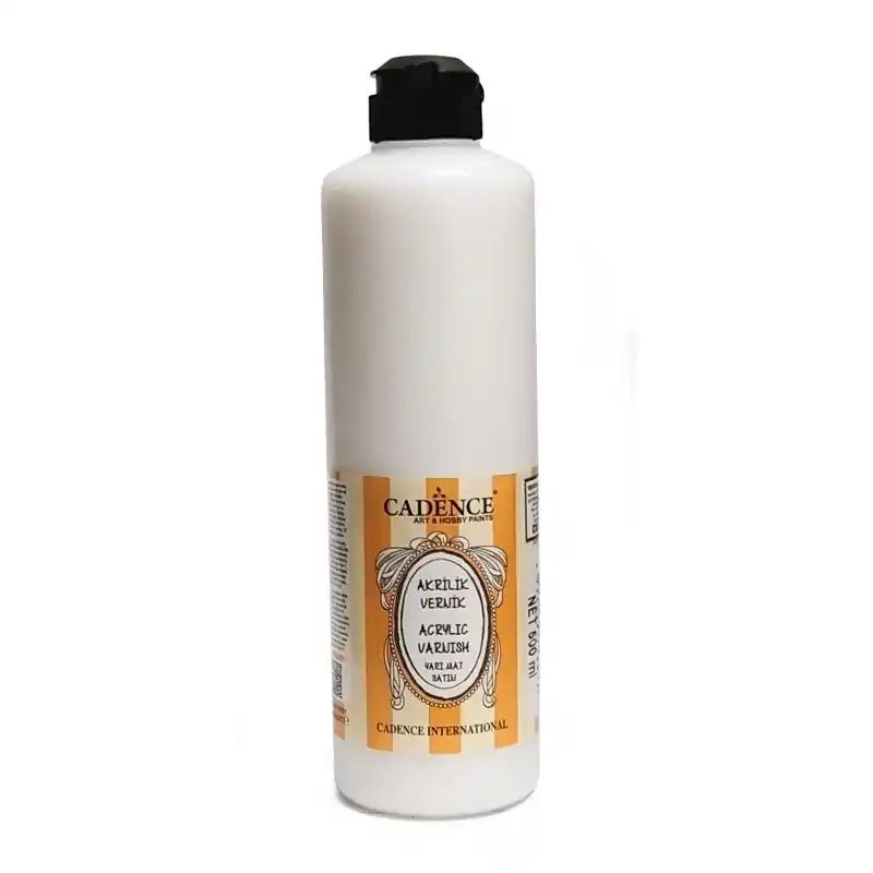 BARNIZ CADENCE ACRÍLICO SATINADO 500 MLEs un barniz acrílico con base de agua que proporciona una alta protección similar a una capa de película. Excepto para técnicas de craquelado se puede utilizar en todas las superficies de artesanía para un acabado acrílico resistente, duradero y transparente. Se recomienda aplicar 2 capas de barniz. Resistente al agua. Las superficies selladas se limpian fácilmente con un paño humedo. Los utensilios se limpian fácilmente con agua y jabón. No tóxico.Certificado por la EN71 CE