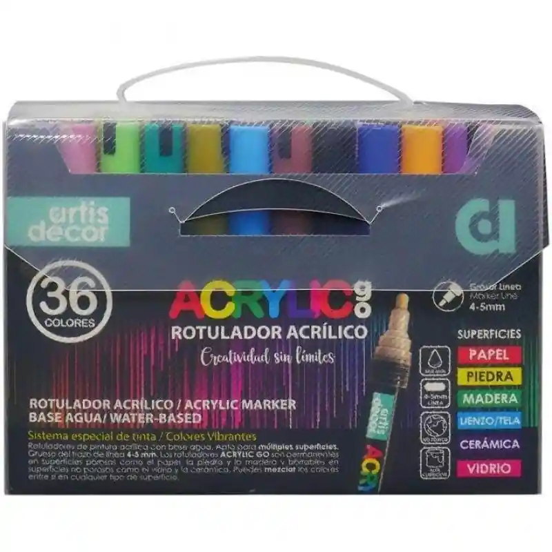 SET 36 ROTULADORES ACRYLIC GO (4-5 mm) ARTIS DECORRotuladores acrílicos, punta de 4-5 mm. Estuche de plástico con 36 colores.Roruladores de pintura acrílica, base agua. Apto para multiples superficies. Grueso del trazo de línea 4-5 mm.Los rotuladores ACRYLIC GO son permanentes en superficies porosas como el papel, la piedra y la madera y borrables en superficies no porosas como el vidrio y la cerámica.Colores mezclables entre sí en cualquier superficie.