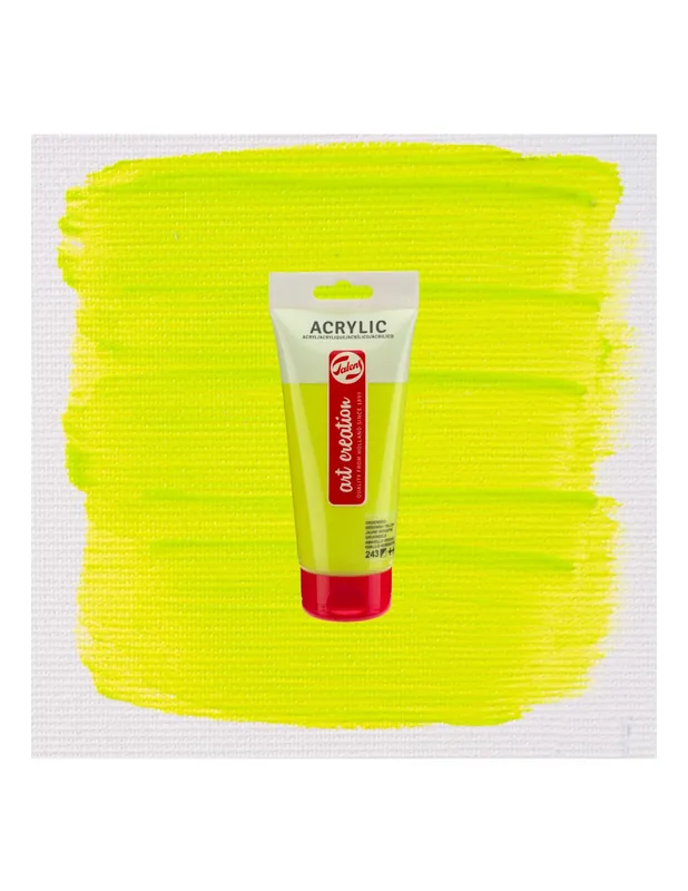 ArtCreation Essentials ofrece un acrílico estudio de calidad fiable a base del 100% de resina de acrilato. La pintura es pastosa, cuando está seca tiene un brillo sedoso y se puede sobrepintar casi de inmediato. La pintura acrílica Talens ArtCreation Essentials puede usarse directamente o diluido con agua, y una vez seco, es resistente al agua. Por su buena adherencia, con esta pintura se puede trabajar sobre cualquier sustrato que sea algo absorbente y esté libre de grasa y polvo, como el lienzo y el papel, pero también el yeso, el tablero, la madera, la piedra o el cementoACRILICO ART CREATION 200ML 243 AMARILLO VERDOSO