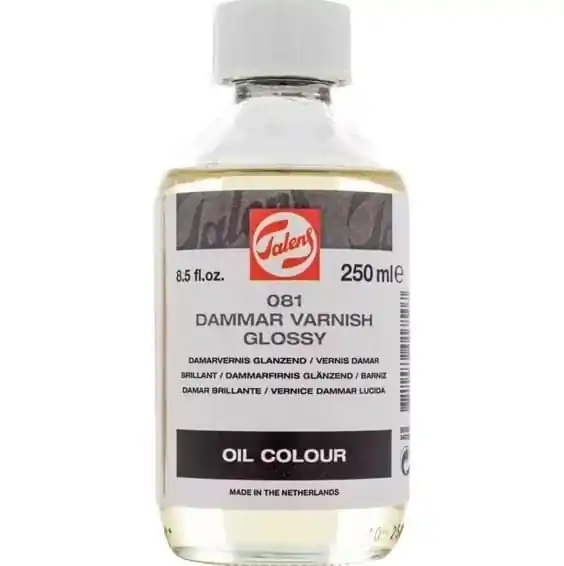 Barniz Damar brillante 081 Talens 250 mlComposición: Resina de Damar y aceite de trementina.Proporciona una protección duradera a las pinturas al óleo. El barniz debe aplicarse cuando la pintura esté completamente seca, lo que puede tardar aproximadamente un año en capas de grosor normal.El barniz seca rápidamente, lo que permite que la pintura se pueda exhibir sin demora. Es importante volver a barnizar la pintura cada pocos años. El barniz proporciona un brillo intenso a la pintura. El barniz se diluye con white spirit y los pinceles se limpian con white spirit o trementina. Las capas de barniz secas se eliminan con trementina.