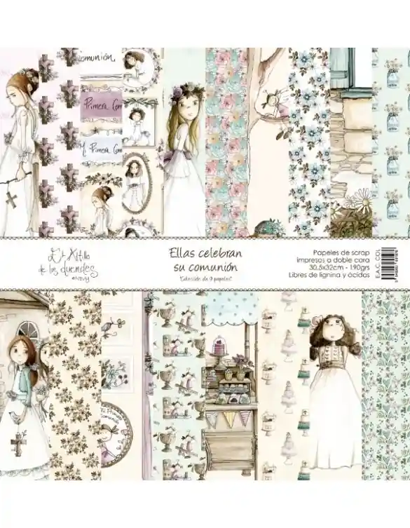 Kit ELLAS CELEBRAN SU COMUNIÓN de EL ALTILLO DE LOS DUENDESConsta de los 6 papeles de la colección Ellas y los tres papeles de la colección Celebrando.Colección de 9 papeles, 30.5×30.5 cm, 190 gr. sin ácidos ni ligninas