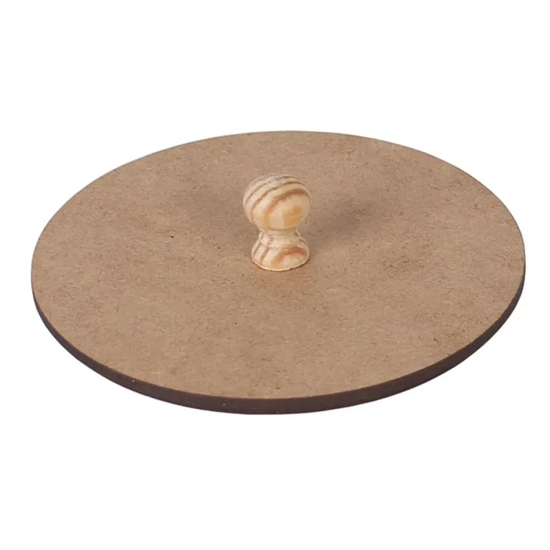 Tapa grande con pomo, (dm) 2,5mm. de espesorSe compone de dos circulos (10,2 / 9,8cm. de diámetro) y un pomo.Esta se utiliza como tapa para decorar latas de conservas para manualidades.