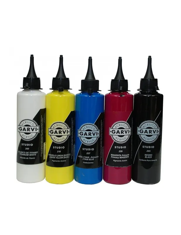 Pack de colores primarios Acrílico studio de Garvi.Acrílicos económicos con una excelente calidad y en un formato muy cómodo con aplicador incluido.Colores formulados con pigmentos de alta calidad y emulsiones acrílicas puras. Su caracteristica cremosa y fluida los hace aptos para todas las técnicas de pintura.