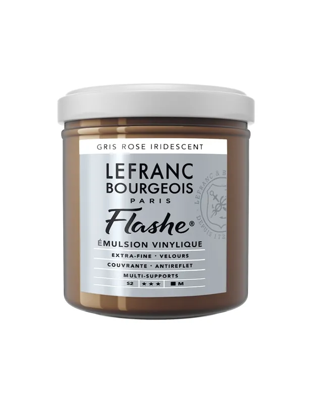 Pintura muy mate , aterciopelada y opaca. Se diluye con agua y se vuelve indeleble una vez seco. Se puede aplicar con pincel, brocha o esponja. Es un producto muy polivalente que ofrece múltiples utilidades como la pintura en tela, decoración interior, preparación de fondos para óleo o acrílico etc. Formato 125 ml presentado en bote de cristal LEFRANC BOURGEOIS ACRILICO FLASHE 125ML Gris rosa iridiscente