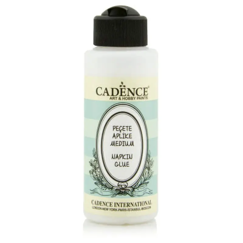 Pegamento Decoupage NAPKING GLUE de Cadence con base de agua especial para adherir servilletas de papel sobre todo tipo de superficies pintables. Aplicar sobre superficies de color claro para potenciar los colores de las servilletas. Limpieza de utensilios fácilmente con agua y jabón. No tóxico.Certificado por la EN71 CE