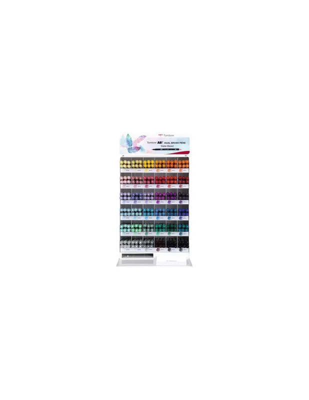 Contenido del expositor ABT 1. 216 bolígrafos a granel (6 x 34 colores (055, 062, 090, 243, 277, 291, 296, 312, 379, 451, 452, 491, 515, 528, 555, 603, 620, 623, 676, 679, 685, 743, 755, 761, 772, 845, 847, 879, 933, 946, 993, N00, N75, N95) + 12 x N15. El expositor y el juego de etiquetas deben pedirse por separado (TOM11380 + TOM11382). Rotulador con dos puntas. La punta fina (grosor de trazo: 0,8 mm) se utiliza principalmente para trazar líneas exactas. La segunda punta (grosor de trazo: 0,8 mm – 3,3 mm) es más gruesa y flexible, como un pincel. Disponible en 107 colores vivos + mezclador. Los colores al agua pueden mezclarse y utilizarse como acuarelas. Perfectos para escribir a mano, acuarelas, ilustraciones, sellos, tarjetas, cómics, manga, diarios y mucho más. Estos rotuladores no contienen ácido, son atóxicos e inodoros. Los colores no son resistentes a la luz.