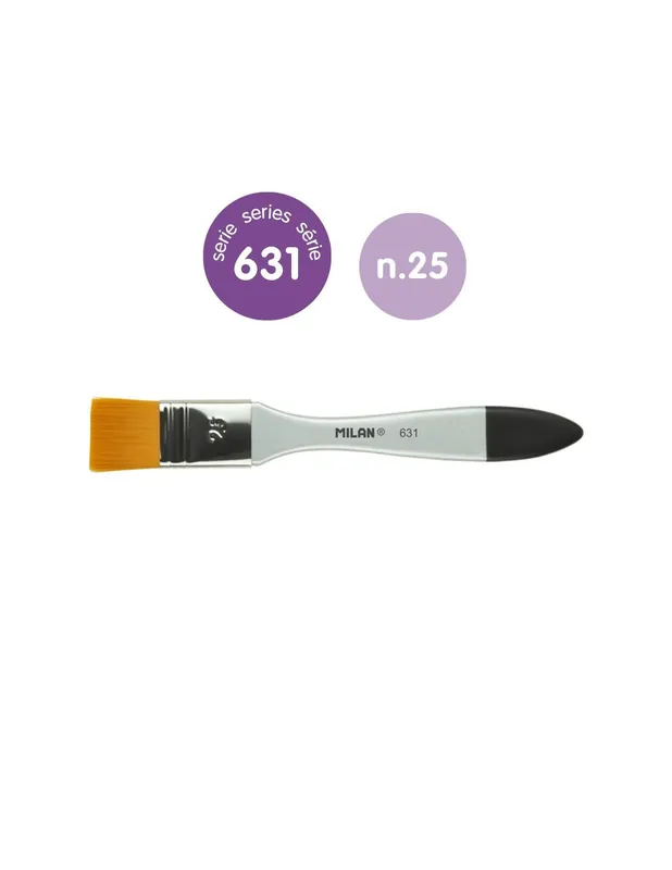 Paletina con mango corto de madera, barnizado plateado y virola niquelada. Composición: pelo sintético (filamentos de Ø 0,10 mm). Adecuado paraacuarela y técnicas acuosas, pintura al óleo y acrílico. Anchura del pelo: 25 mm. Longitud del pelo: 25,2 mm. Longitud de la paletina: 185 mm.