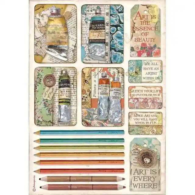 PAPEL ARROZ STAMPERIA A4 ATELIER TUBES AND PENCILS Oferta Limitada