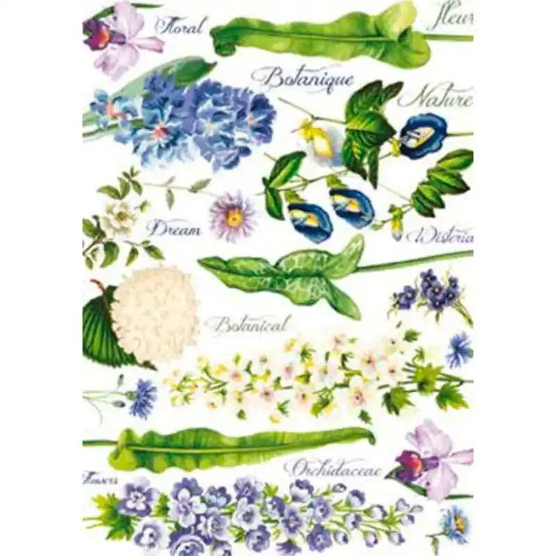 Es un papel muy ligero, semi-transparente y de color blanco natural. Tiene fibras irregulares y con distintos grosores y direcciones, que se aprecian a simple vista. El papel es fuerte y resistente, No se rompe en las manos. No se arrugaBonitos diseños con intensos colores, que no destiñen ni se degradan con un pegamento.Cada estampa hay que arrancarla de la hoja y no recortarla usando tijeras. El borde irregular del papel de arroz, es muy fácil de esconder. Se puede pegar fácilmente en todas las superficies, usadas en decoupage (vidrio, madera, dm, poliestireno, etc.)La obra final se protege dando algunas capas de barniz, para un resultado óptimo.