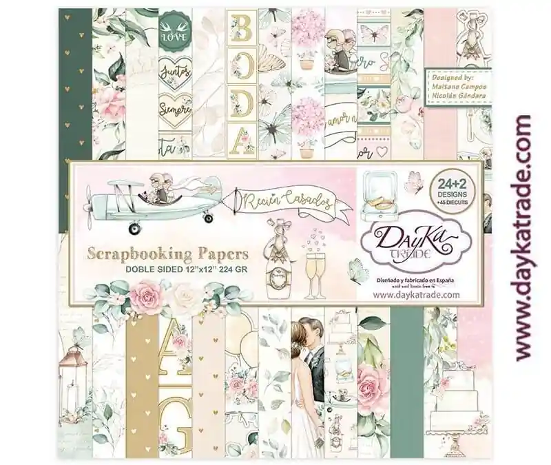 Kit scrap boda colección &lRecién casados&r Dayka 12″X12″ 24+2 papeles de 12×12 pulgadas (30,5×30,5 cm aprox.). 12 modelos a doble cara + 2 fondos. El kit incluye 45 Die cuts de boda.Papeles incluidos: Del SCP-495 al SCP-506 (2 de cada)
