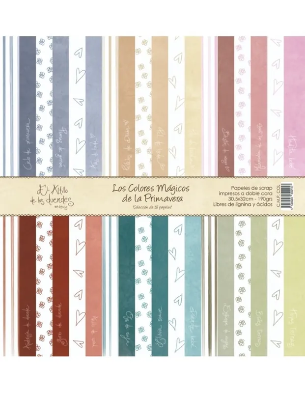 Kit LOS COLORES MÁGICOS DE LA PRIMAVERA de EL ALTILLO DE LOS DUENDESColección de básicos para combinar con todas las colecciones del Altillo.Delanteras con motivos sencillos, pero no por ello carentes de fuerza como todos los diseños del Altillo, y traseras con colores lisos en aguada de acuarela. Los lisos con los tonos exactos de las colecciones del Altillo.18 papeles decorados a doble cara libres de ácidos y ligninas. 190 gr. y la carátula30.5×32 cm