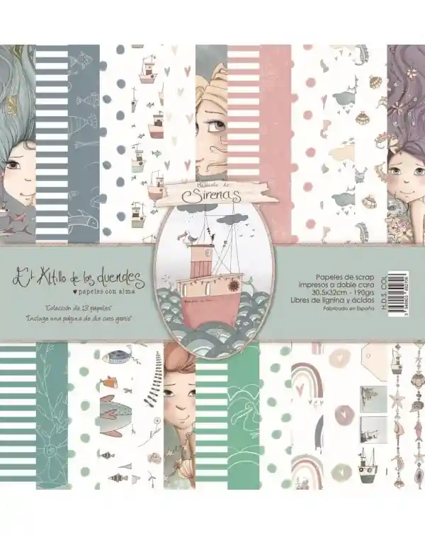 Kit HABLANDO DE SIRENAS de EL ALTILLO DE LOS DUENDESColección de 13 papeles más la portada. 30.5×30.5 cm, 190 gr. sin ácidos ni ligninas.El Altillo de los Duendes nos sorprende una vez más con una colección veraniega, fresca, divertida. Llena de colores claros y muy luminosos, llenos de luz.En la contraportada podrás encontrar muchos recortables, además de una hoja con etiquetas