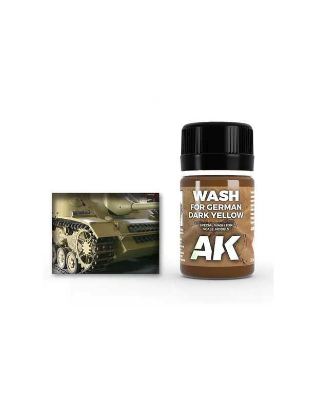 Producto Esmalte. Lavado especialmente diseñado para resaltar volúmenes sobre el amarillo oscuro alemán (Dunkelgelb), pero también es ideal para vehículos en tonos medios y con camuflajes tritonales. Este es un producto tipo esmalte y se puede diluir usando nuestro White Spirit u Odorless Turpentine.