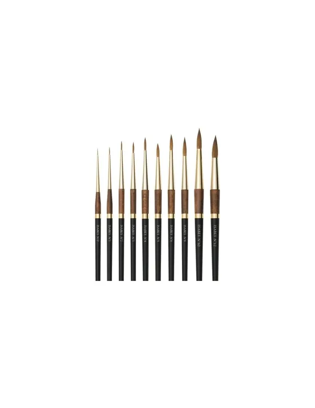 El pincel para acuarela Isabey 6227i esta fabricado con pelo Marta de Kolinsky extra pura, virola de latón niquelado, mango barnizado en negro, anillo de oro, es un pincel cuya principal característica es su elasticidad y resistencia, ofreciendo en todos tus trabajos precisión y detalle. Son pinceles fabricados siguiendo altos estándares de calidad