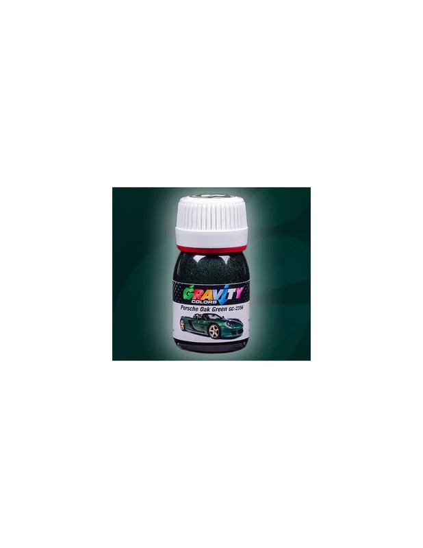 Dark pearl green color, coded as “22L”, used by Porsche since 1976.  Agitar el frasco hasta que la pintura esté bien mezclada.  ¡Utilizar sólo con aerógrafo!  Aplicar sobre la imprimación de superficie oscura si la imprimación de superficie clara no es la óptima para otro color utilizado para pintar la misma pieza.  Pintar en capas finas hasta conseguir la densidad del color. La pintura no debe arreglar o eliminar las imperfecciones de la superficie de plástico de su maqueta. En otras palabras, no aplique nunca capas húmedas.  Recomendamos utilizar una presión de aire baja, entre 15 y 20 PSI (1,0 a 1,4 BAR) al pulverizar las pinturas Gravity Colors. Esto es sólo una recomendación. La presión óptima es única para cada usuario, y depende del diámetro de la boquilla, la distancia de pulverización o la velocidad, entre otros factores.  Se requiere una capa transparente.  No utilizar cerca del calor, chispas o llamas.  Utilizar en un área bien ventilada.  Apretar bien el tapón después de cada uso.