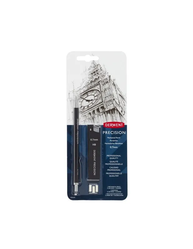 Portaminas de precisión, ideal para dibujo técnico y artístico.Diametro de mina 0.7mm, incluye estuche de minas dureza hb y gomas de borrar de recambio