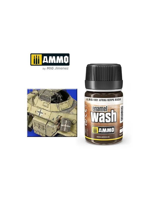 Lavados para vehículos del Africa Korps, también se puede utilizar para otros colores claros  desérticos. Aplicar en los detalles y quitar el exceso con un pincel limpio humedecido en Diluyente para Esmaltes.