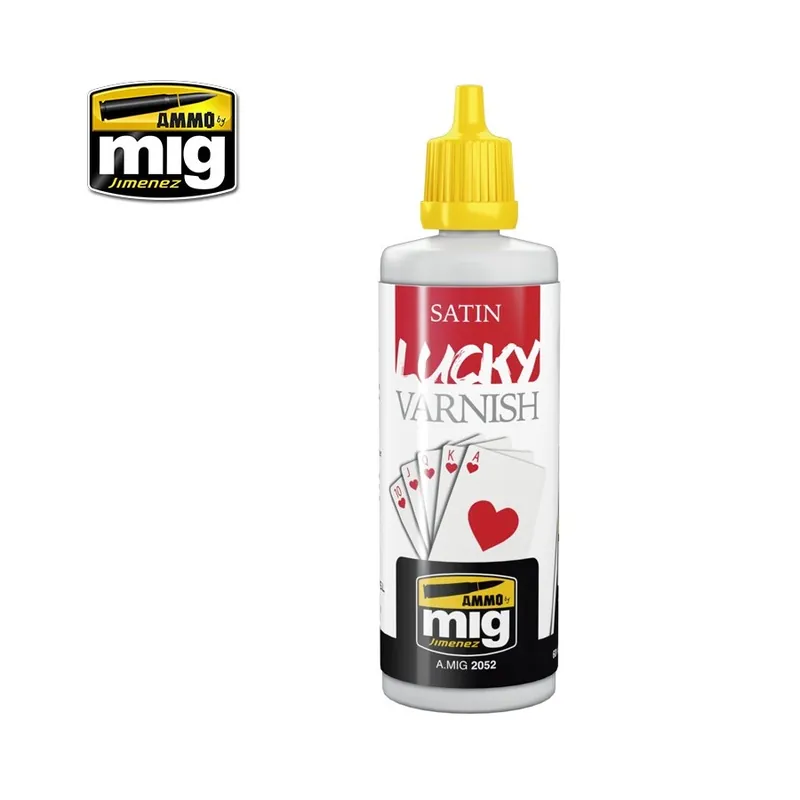 La aplicación de los barnices siempre ha sido el gran reto de todos los modelistas. Muchos han encontrado un final desastroso por usar barnices incorrectos, o de mala calidad. Y es que el proceso de barnizado es muy importante cuando hacemos maquetas. Por primera vez, AMMO ofrece una gama completa que hará al modelista ganador con cada reto.Este Barniz Acrílico nos permitirá conseguir el máximo rendimiento tanto a aerógrafo como a pincel de una manera sencilla, empleándolo en capas finas. Se puede aplicar directamente del bote sin necesidad de disolverlo, obteniendo un acabado perfecto. Aplicado a aerógrafo se recomienda pulverizar desde una distancia de 15 cm. Este producto no es tóxico y carece de olor. Soluble en agua. Agitar bien antes de cada uso. Secado completo en 24 horas.Ésta nueva gama de barnices, ha sido desarrollada durante varios años hasta estar seguros de que el modelista siempre ganará el juego del barniz. No juegues con la suerte, confía en la combinación ganadora de los nuevos LUCKY VARNISH. Sólo así, podremos estar seguros que el resultado de nuestras maquetas no dependerá del azar de un barniz cualquiera. Puedes completar tu colección para poder cubrir todas la áreas del modelismo, desde acabados completamente brillantes hasta ultramates.