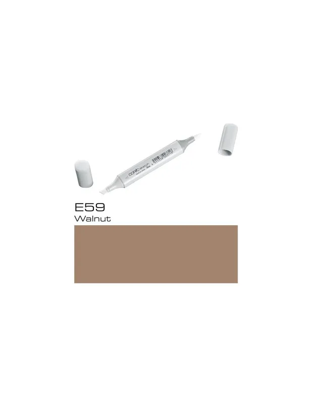 ROTULADOR COPIC SKETCH E59 WalnutCOPIC SKETCH E59 WalnutLos rotuladores copic sketch son los rotuladores preferidos de los profesionales del diseño, la ilustración, el dibujo manga y el scrap.Con sus 358 colores tienes todo un mundo de posibilidades a tu alcance, es la mayor gama de colores que existe en rotuladores, dificilmente no encontrarás aquella tonalidad que estás buscando.El rotulador copic sketch tiene dos puntas: una biselada para colorear grandes áreas y otra de pincel muy flexible ideal para dibujar. Las puntas se pueden cambiar cuando se gastan.Son rotuladores recargables, se puede volver a aprovechar la carcasa, con un frasco de tinta copic ink de 25 cc puedes rellenar hasta 12 veces un sketch.La tinta copic es a base de alcohol, es permanente y no es tóxica. Cuando se seca está libre de ácido.Los rotuladores copic sketch se pueden utilizar también con el sistema de aerografia copic.