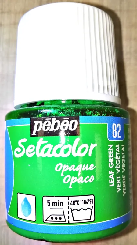 Pintura para tela Setacolor opaco efecto mate de 45ml de Pebeo.Setacolor opaco es una pintura de base agua destinada a la decoración de telas oscuras, tanto finas como gruesas. De altísima calidad sus colores son vivos, intensos y duraderos, además de altamente resistentes a la luz.Sus propiedades los hacen mezclables entre sí y no es necesario diluirlos en agua, vienen listos para usarse.Aptos para la mayoría de tejidos, de fibra o sintéticos, su acabado es mate, opaco y muy duradero.Una vez aplicada la pintura se ha de dejar secar 1 hora al aire libre.Para fijar la pintura a la tela puedes hacerlo de dos maneras, con la plancha durante 5 minutos, en posición algodón, sin vapor, sobre el reverso del tejido o bien en el horno doméstico, durante 5 minutos a 150ºC.Utilizado en conjunto con los auxiliares Setacolor se pueden obtener diversos efectos para multiplicar las técnicas.Disponible: 23 colores de pintura para tela Setacolor Opaco 45ml.Limpieza Herramientas: Agua y jabón.