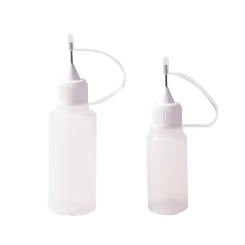 Aplicador punta de aguja 2 piezas: 10 y 20 mlEl aplicador con punta ultrafina es ideal para aplicar con precisión pegamento, pintura y demás fluidos. Cada envase contiene dos frascos con punta de aguja. Los frascos son de plástico, tienen una capacidad 10 y 20 ml y están provistos de un tapón para evitar fugas.Es reutilizable y se puede emplear como herramienta de precisión. Muy util cuando se trata de fijar o colorear accesorios pequeños. Este aplicador de punta ultrafina lo puedes usar para trazar líneas delgadas o aplicar puntos con el material fluido que corresponda, para escribir o para dibujar. Rellene el frasco con su pegamento, tinta líquida o pintura favoritos.