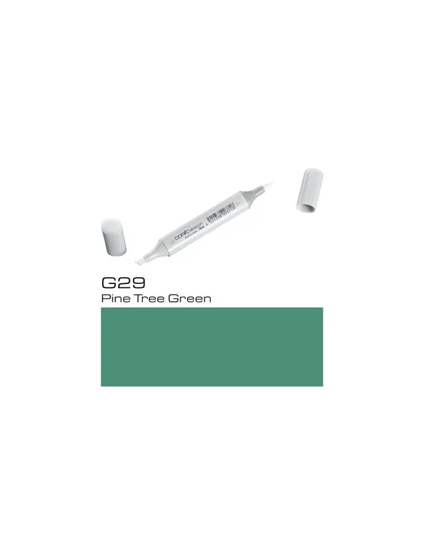 ROTULADOR COPIC SKETCH G29 Pine Tree GreenCOPIC SKETCH G29 Pine Tree GreenLos rotuladores copic sketch son los rotuladores preferidos de los profesionales del diseño, la ilustración, el dibujo manga y el scrap.Con sus 358 colores tienes todo un mundo de posibilidades a tu alcance, es la mayor gama de colores que existe en rotuladores, dificilmente no encontrarás aquella tonalidad que estás buscando.El rotulador copic sketch tiene dos puntas: una biselada para colorear grandes áreas y otra de pincel muy flexible ideal para dibujar. Las puntas se pueden cambiar cuando se gastan.Son rotuladores recargables, se puede volver a aprovechar la carcasa, con un frasco de tinta copic ink de 25 cc puedes rellenar hasta 12 veces un sketch.La tinta copic es a base de alcohol, es permanente y no es tóxica. Cuando se seca está libre de ácido.Los rotuladores copic sketch se pueden utilizar también con el sistema de aerografia copic.