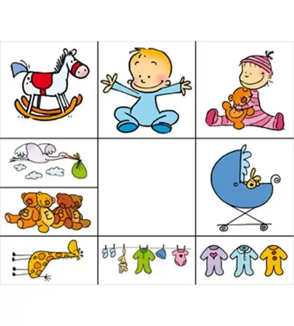 Set sellos infantiles madera «bebé»Contiene:- Tampón de tinta color negro.- 9 sellos de madera para estampar.