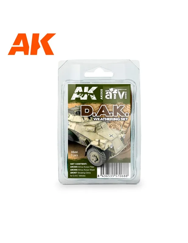 Los vehículos en el norte de África, especialmente los alemanes, son uno de los temas preferidos por muchos modelistas. Aunque puedes encontrar otro set en nuestro catalogo con algunos colores de África para simular el polvo (dust) este set es totalmente novedoso y especifico para vehículos alemanes en el norte de África, aunque por supuesto también puedes usarlo en vehículos aliados e incluso modernos. El set contine tres productos diferentes para hacer lavados, filtros y efectos escurridos de suciedad (streaking grime), es decir, todo lo necesario para hacer el envejecido básico (basic weathering) en tus modelos. Los colores incluidos son: AK-065 Africa Korps Filter AK-066 Africa Korps Wash AK-067 Streaking Grime for Africa Korps