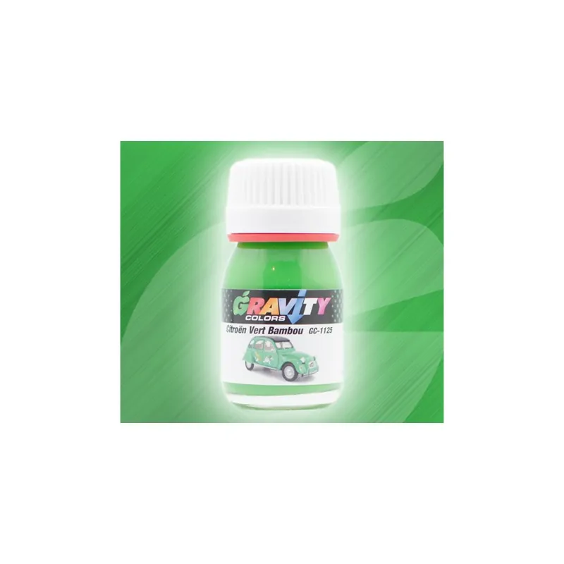 Citroën Vert Bambou Gravity Colors Paint– GC-1125 Solid green used by Citroën between 1975 and 1991 for ist 2CV, especially for the “Sausss Ente” Edition. Color matched airbrush ready lacquer paint. Net volume: 1 fl.oz/30ml