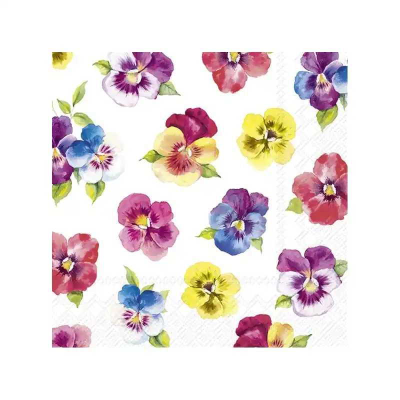 20 servilletas con motivos para decoupage de tamaño abierto 33×33 cm. Gran calidad. Servilletas de papel de 3 capas. Modelo Peppy pansies. Motivo de flores pensamientos de IHR Ideal Home Range. Precio por 20 servilletas.Te recomendamos que utilices un pegamento adecuado según el soporte sobre el que vayas a pegar la servilleta. Artpotch si el soporte es de madera o escayola. Porcelain potch si utilizas cerámica o porcelana y textil potch para textil. Disponemos de todos ellos en nuestra tienda online en varios tamaños.Fácil aplicación: Nuestras servilletas de decoupage están diseñadas para facilitar su aplicación, incluso para principiantes. Con solo unos simples pasos, puedes transformar cualquier superficie en una obra de arte. Simplemente separa las capas de la servilleta, aplica pegamento de decoupage en la superficie y coloca la servilleta con cuidado. Luego, sella la servilleta con una capa adicional de pegamento y déjala secar. ¡Obtén resultados sorprendentes sin complicaciones!Versatilidad creativa: Las servilletas de decoupage son extremadamente versátiles y se adaptan a una amplia gama de proyectos artísticos. Puedes utilizarlas para decorar muebles, como mesas, sillas o cómodas, agregando un toque de estilo único a tu hogar. También son ideales para embellecer cajas de madera, marcos de fotos, bandejas, tarjetas y más. Deja volar tu imaginación y dale vida a tus ideas creativas con estas servilletas.