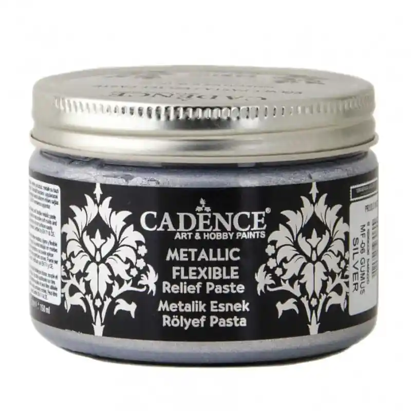 Pasta de relieve Cadence metalizada FLEXIBLE y ligera a base de agua.Se puede trabajar en moldes blandos decorativos y se puede aplicar fácilmente sobre superficies curvas.Colores mezclables entre si.Certificado por EN71 y CENo tóxico