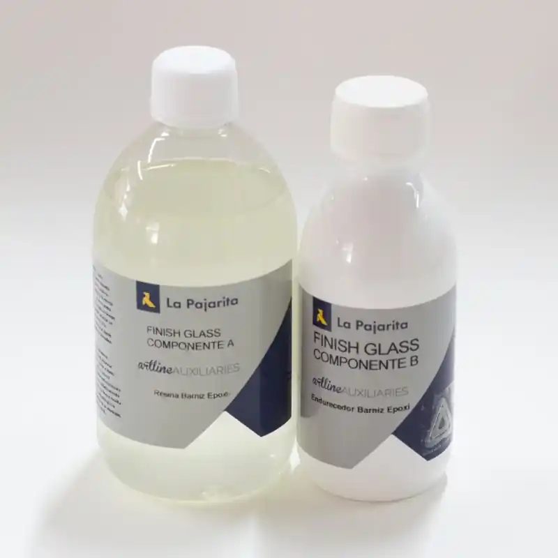 KIT FINISH GLASS LA PAJARITA 2 COMPONENTES (500+250 ML)Barniz incoloro en base resina epoxi con dos componentes, A y B, cuya mezcla produce acabados cristalinos de elevada dureza y brillo.El kit incluye: Resina Exoxi – Componente A; Endurecedor – Componente B. Deben ser mezclados en proporción 2:1Se puede tintar con Laca Cristal para crear acabados coloreados.Superficies: Madera, cartón, metal, yeso, cerámica y piedra.Aplicación: Brocha, pincel o vertido directamente del envase donde se ha realizado la mezcla.Peligro:Contiene componentes epoxídicos. Puede provocar una reacción alérgica.Nocivo en caso de ingestión.Nocivo en caso de inhalación.Provoca irritación cutánea.Provoca irritación ocular grave.Provoca quemaduras graves en la piel y lesiones oculares graves.Puede provocar una reacción alérgica en la piel.Tóxico para los organismos acuáticos, con efectos nocivos duraderos.