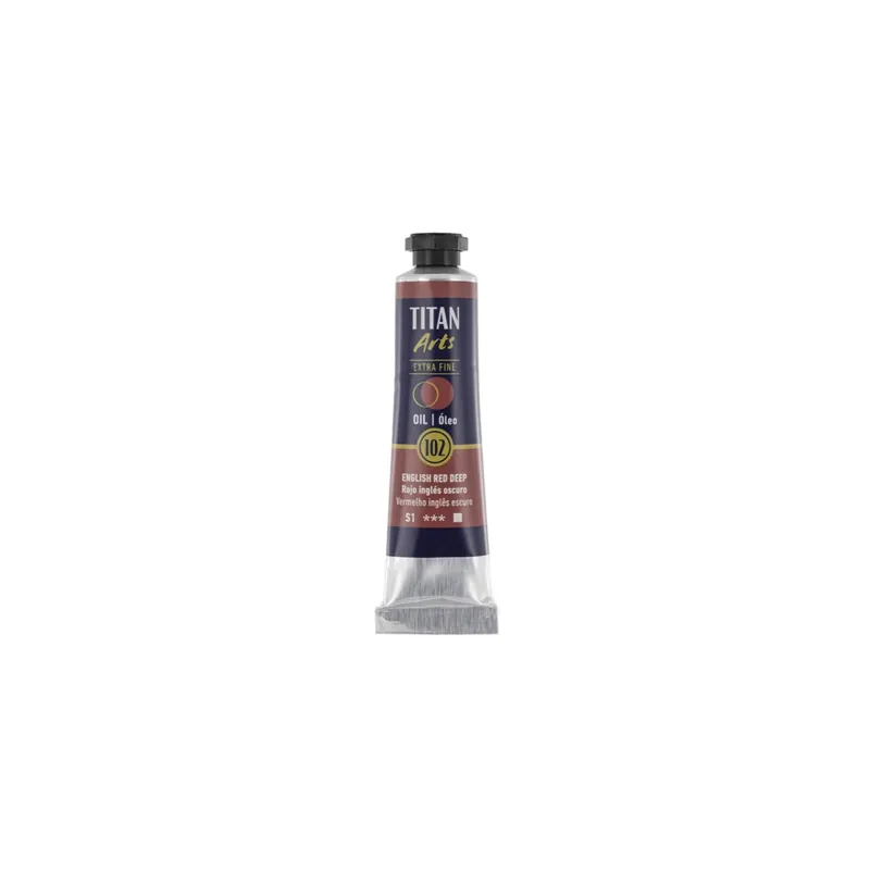TITAN Óleo Extrafino 20ml Especial para aplicar sobre lienzos de lino, algodón u otros, debidamente preparados. (Colores orientativos según carta del fabricante)Los colores al óleo TITAN Arts Extra Fine esta pensados para los artistas más exigentes, que buscan una calidad extrafina. La pintura al óleo se elabora de forma tradicional con los mejores pigmentos finamente molidos, aportando un óptimo poder de colorante gracias a la alta concentración de pigmento. La gama ofrece colores muy puros e intensos y un grado máximo de resistencia a la luz con una gran durabilidad de la capa de pintura. Rojo inglés oscuro N°102. Tubo 20 ml.También puede aplicarse sobre otros soportes, como madera, táblex, cartón, etc., siempre que estén impermeabilizados con una adecuada preparación, para que tengan una buena adherencia.Secado a 23ºC 60 % HR: 1 día – 15 días (según pigmentación).Los tiempos de secado, se corresponden a una aplicación de un grosor aproximado entre 0,1 y 0,5mm.Métodos de Aplicación: Pincel, paletina o espátula.Limpieza de utensilios: Limpia Pinceles, disolvente.Presentación: Tubos: 20 ml, 60 ml y 200ml