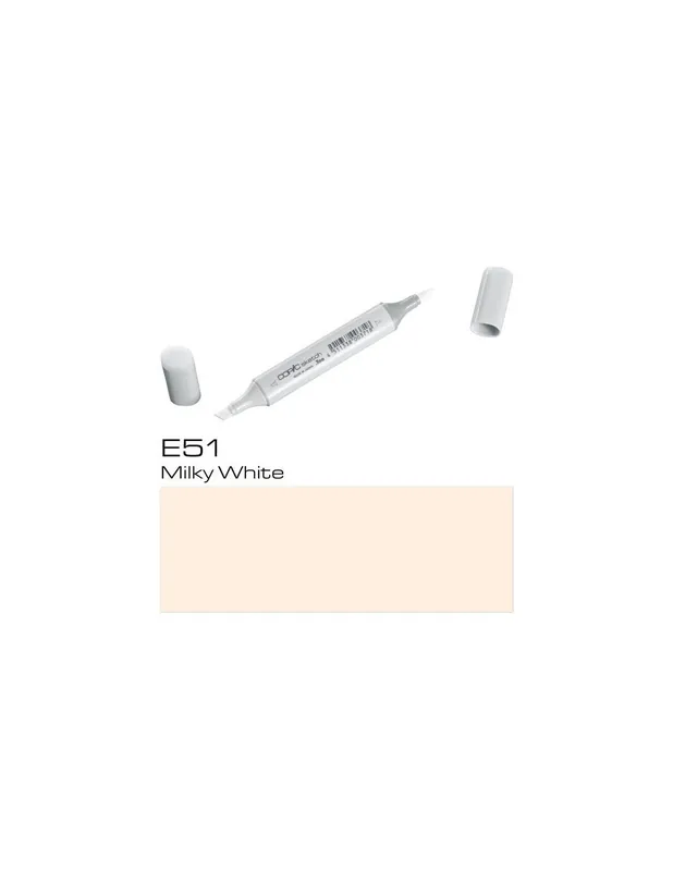 ROTULADOR COPIC SKETCH E51 Milky WhiteCOPIC SKETCH E51 Milky WhiteLos rotuladores copic sketch son los rotuladores preferidos de los profesionales del diseño, la ilustración, el dibujo manga y el scrap.Con sus 358 colores tienes todo un mundo de posibilidades a tu alcance, es la mayor gama de colores que existe en rotuladores, dificilmente no encontrarás aquella tonalidad que estás buscando.El rotulador copic sketch tiene dos puntas: una biselada para colorear grandes áreas y otra de pincel muy flexible ideal para dibujar. Las puntas se pueden cambiar cuando se gastan.Son rotuladores recargables, se puede volver a aprovechar la carcasa, con un frasco de tinta copic ink de 25 cc puedes rellenar hasta 12 veces un sketch.La tinta copic es a base de alcohol, es permanente y no es tóxica. Cuando se seca está libre de ácido.Los rotuladores copic sketch se pueden utilizar también con el sistema de aerografia copic.