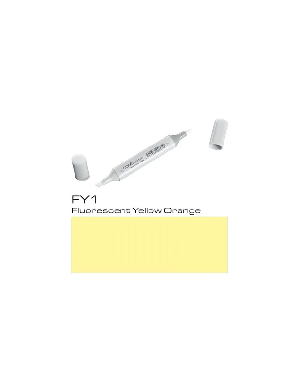 ROTULADOR COPIC SKETCH FY1 Fluorescent Yellow OrangeCOPIC SKETCH FY1 Fluorescent Yellow OrangeLos rotuladores copic sketch son los rotuladores preferidos de los profesionales del diseño, la ilustración, el dibujo manga y el scrap.Con sus 358 colores tienes todo un mundo de posibilidades a tu alcance, es la mayor gama de colores que existe en rotuladores, dificilmente no encontrarás aquella tonalidad que estás buscando.El rotulador copic sketch tiene dos puntas: una biselada para colorear grandes áreas y otra de pincel muy flexible ideal para dibujar. Las puntas se pueden cambiar cuando se gastan.Son rotuladores recargables, se puede volver a aprovechar la carcasa, con un frasco de tinta copic ink de 25 cc puedes rellenar hasta 12 veces un sketch.La tinta copic es a base de alcohol, es permanente y no es tóxica. Cuando se seca está libre de ácido.Los rotuladores copic sketch se pueden utilizar también con el sistema de aerografia copic.