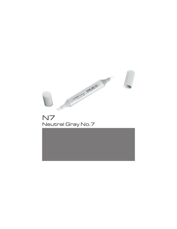ROTULADOR COPIC SKETCH N7 Neutral Gray No.7COPIC SKETCH N7 Neutral Gray No.7Los rotuladores copic sketch son los rotuladores preferidos de los profesionales del diseño, la ilustración, el dibujo manga y el scrap.Con sus 358 colores tienes todo un mundo de posibilidades a tu alcance, es la mayor gama de colores que existe en rotuladores, dificilmente no encontrarás aquella tonalidad que estás buscando.El rotulador copic sketch tiene dos puntas: una biselada para colorear grandes áreas y otra de pincel muy flexible ideal para dibujar. Las puntas se pueden cambiar cuando se gastan.Son rotuladores recargables, se puede volver a aprovechar la carcasa, con un frasco de tinta copic ink de 25 cc puedes rellenar hasta 12 veces un sketch.La tinta copic es a base de alcohol, es permanente y no es tóxica. Cuando se seca está libre de ácido.Los rotuladores copic sketch se pueden utilizar también con el sistema de aerografia copic.