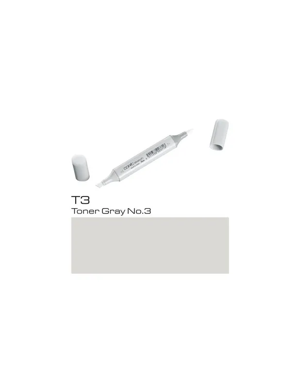 ROTULADOR COPIC SKETCH T3 Toner Gray No.3COPIC SKETCH T3 Toner Gray No.3Los rotuladores copic sketch son los rotuladores preferidos de los profesionales del diseño, la ilustración, el dibujo manga y el scrap.Con sus 358 colores tienes todo un mundo de posibilidades a tu alcance, es la mayor gama de colores que existe en rotuladores, dificilmente no encontrarás aquella tonalidad que estás buscando.El rotulador copic sketch tiene dos puntas: una biselada para colorear grandes áreas y otra de pincel muy flexible ideal para dibujar. Las puntas se pueden cambiar cuando se gastan.Son rotuladores recargables, se puede volver a aprovechar la carcasa, con un frasco de tinta copic ink de 25 cc puedes rellenar hasta 12 veces un sketch.La tinta copic es a base de alcohol, es permanente y no es tóxica. Cuando se seca está libre de ácido.Los rotuladores copic sketch se pueden utilizar también con el sistema de aerografia copic.
