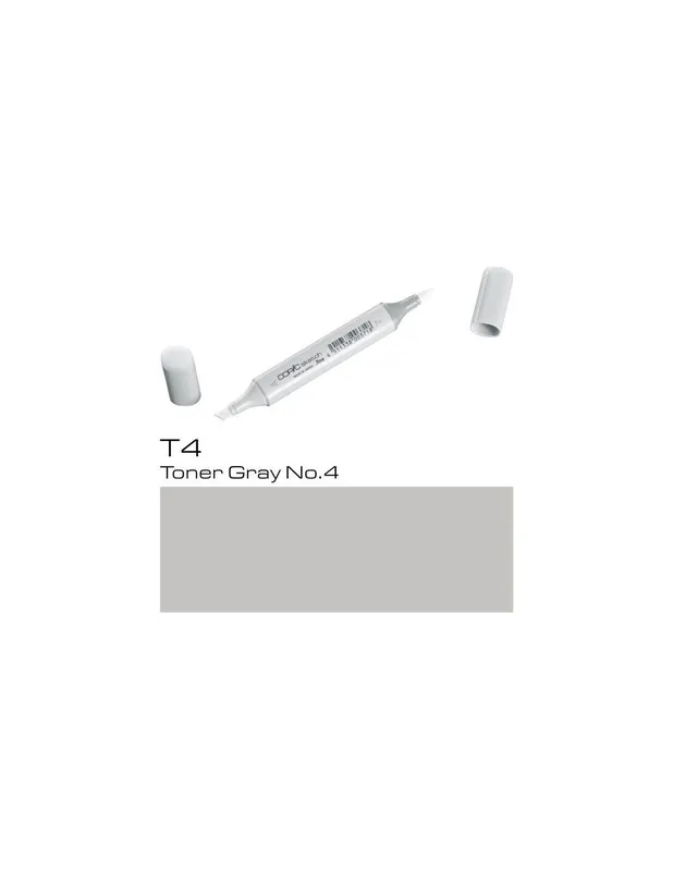 ROTULADOR COPIC SKETCH T4 Toner Gray No.4COPIC SKETCH T4 Toner Gray No.4Los rotuladores copic sketch son los rotuladores preferidos de los profesionales del diseño, la ilustración, el dibujo manga y el scrap.Con sus 358 colores tienes todo un mundo de posibilidades a tu alcance, es la mayor gama de colores que existe en rotuladores, dificilmente no encontrarás aquella tonalidad que estás buscando.El rotulador copic sketch tiene dos puntas: una biselada para colorear grandes áreas y otra de pincel muy flexible ideal para dibujar. Las puntas se pueden cambiar cuando se gastan.Son rotuladores recargables, se puede volver a aprovechar la carcasa, con un frasco de tinta copic ink de 25 cc puedes rellenar hasta 12 veces un sketch.La tinta copic es a base de alcohol, es permanente y no es tóxica. Cuando se seca está libre de ácido.Los rotuladores copic sketch se pueden utilizar también con el sistema de aerografia copic.