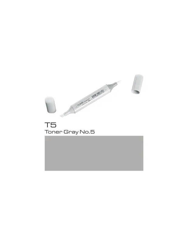 ROTULADOR COPIC SKETCH T5 Toner Gray No.5COPIC SKETCH T5 Toner Gray No.5Los rotuladores copic sketch son los rotuladores preferidos de los profesionales del diseño, la ilustración, el dibujo manga y el scrap.Con sus 358 colores tienes todo un mundo de posibilidades a tu alcance, es la mayor gama de colores que existe en rotuladores, dificilmente no encontrarás aquella tonalidad que estás buscando.El rotulador copic sketch tiene dos puntas: una biselada para colorear grandes áreas y otra de pincel muy flexible ideal para dibujar. Las puntas se pueden cambiar cuando se gastan.Son rotuladores recargables, se puede volver a aprovechar la carcasa, con un frasco de tinta copic ink de 25 cc puedes rellenar hasta 12 veces un sketch.La tinta copic es a base de alcohol, es permanente y no es tóxica. Cuando se seca está libre de ácido.Los rotuladores copic sketch se pueden utilizar también con el sistema de aerografia copic.